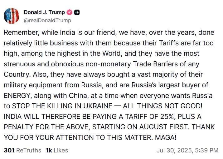 अमेरिकी राष्ट्रपति ने सोशल मीडिया पर पोस्ट कर लिखा, “भारत, अमेरिका का दोस्त है, लेकिन पिछले कुछ सालों में अमेरिका ने भारत के साथ कम व्यापार किया है, क्योंकि उनके टैरिफ बहुत ज्यादा हैं।​ दरअसल, भारत की कई नीतियां ऐसी हैं जो अमेरिकी कंपनियों को व्यापार करने में मुश्किलें पैदा करती हैं।”