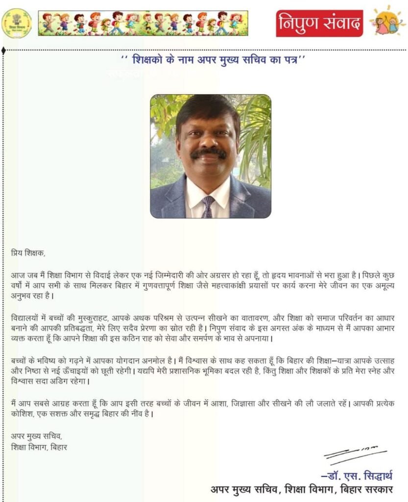 अपर मुख्य सचिव शिक्षा विभाग के पद पर ज्वाइन करते ही निपुण संवाद पत्रिका के माध्यम से गुणवत्तापूर्ण शिक्षा का बिगुल फूंकने वाले डॉ सिद्धार्थ ने कुछ ही दिनों में विद्यालय संचालन हेतु आठ पन्नों की मार्गदर्शिका को सभी प्रधानाध्यापकों के नाम प्रेषित किया और यहीं से शुरू होती है एक बदलते बिहार की कहानी।